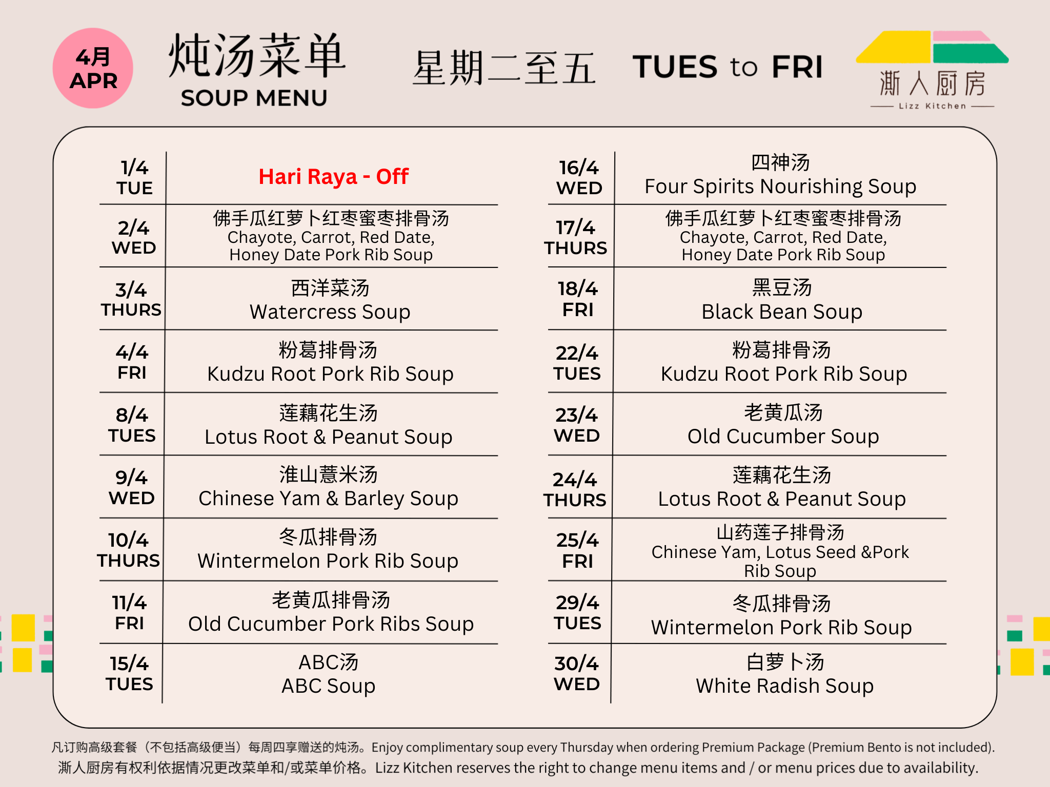 *The complimentary traditional soup every Thursday is only available with the premium set (without rice), and is not included with the premium bento set.